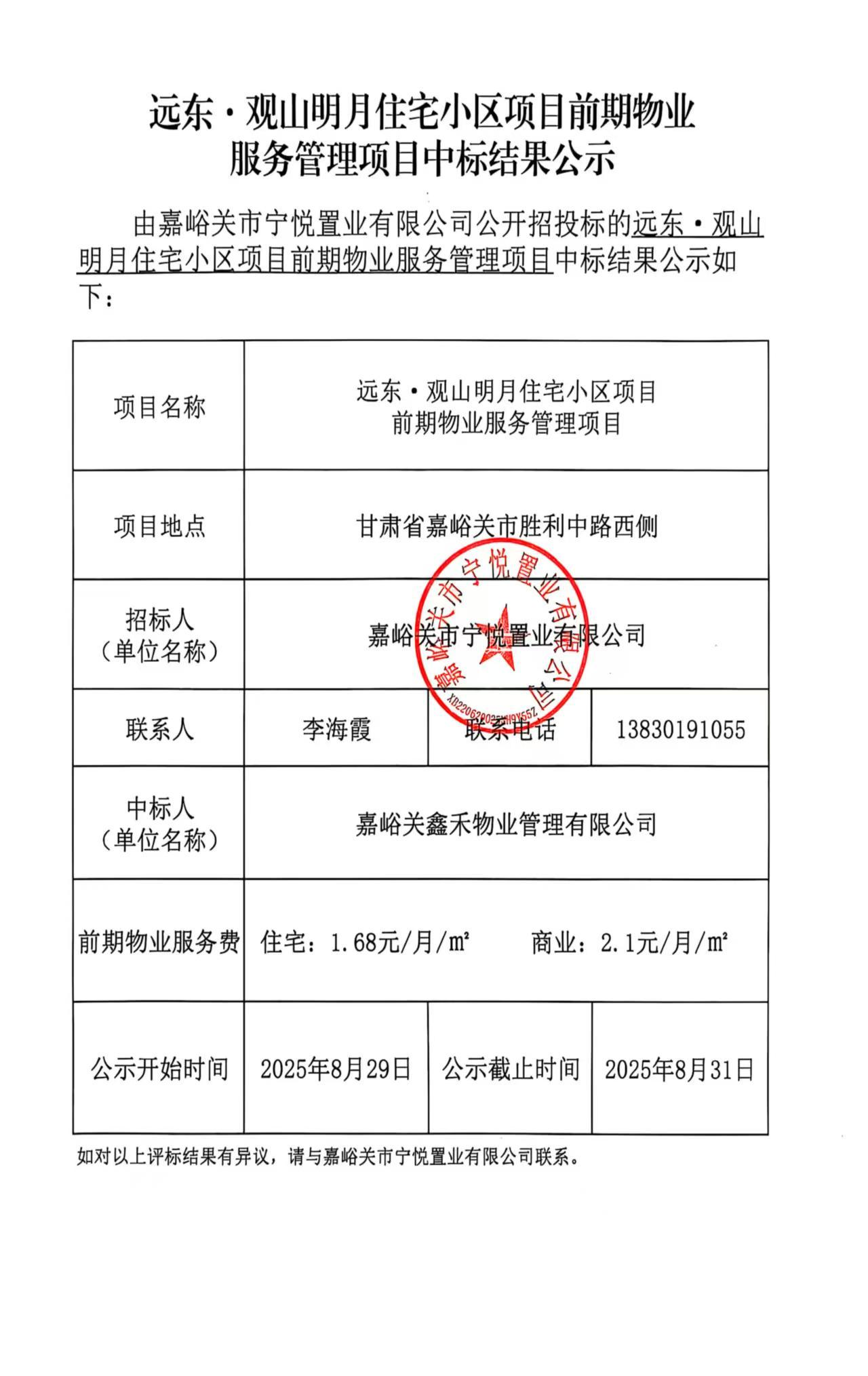 遠東·觀山明月住宅小區(qū)項目前期物業(yè)服務(wù)管理項目中標(biāo)結(jié)果公示