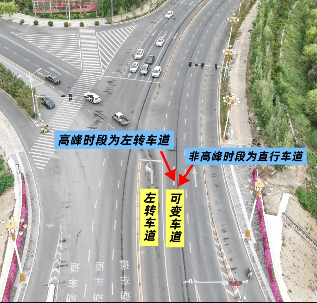 (二)高峰時段(07:00-09:00;11:30-13:00;14:00-15:00;17:30-19:30),路口南側第二車道由直行通行調整為左轉通行,同時該車道直行信號燈調整為左轉信號燈;非高峰時段,該車道恢復直行通行,其它車道通行方向不變。