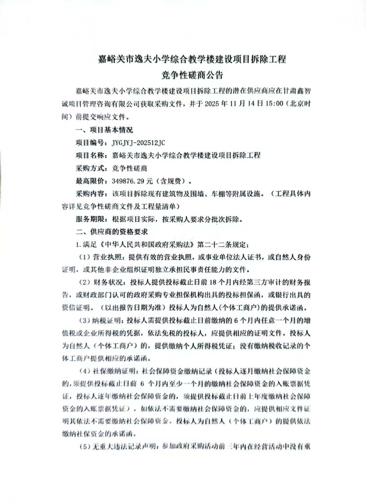 嘉峪關市逸夫小學綜合教學樓建設項目拆除工程競爭性磋商公告