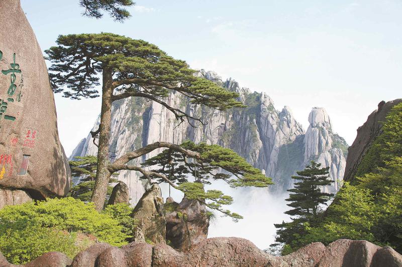 古樹名木與險峰、幽谷、奇石、古跡等交相輝映,孕育出巧奪天工的獨特意境。黃山松,壽逾千年,歷經(jīng)滄海桑田孕育而出,它的種子在巖壁的裂縫中,以無堅不摧的鉆勁,發(fā)芽、生根、成長,以特有的造型和自然環(huán)境相輔相成。黃山松上部枝葉虬結(jié)平密,樹冠如幡似蓋,且偏向一側(cè),下部有兩大側(cè)枝橫空斜出,展現(xiàn)欲攬五湖四海、迎送八方賓朋的雍容俊美的姿態(tài),又似頷首展臂向游人致意,令人叫絕。“迎客松”,已成為中國人民對外開放、擁抱世界、熱情友好的象征。