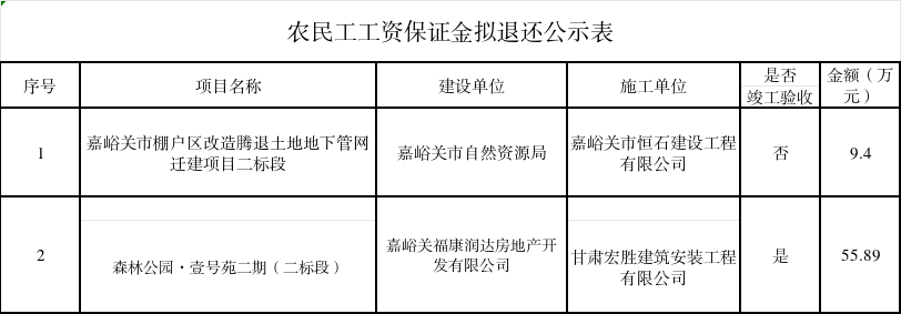根據《嘉峪關市貫徹落實<甘肅省工程建設領域農民工工資保證金管理辦法>實施意見》相關規定,現對以下工程項目(見附件)申請退還農民工工資保證金情況進行公示,如發現存在拖欠農民工工資行為,請及時攜帶有關證據材料前往嘉峪關市人力資源和社會保障局勞動保障監察科投訴舉報。如不存在工資拖欠問題,我局將按規定程序退還農民工工資保證金。
