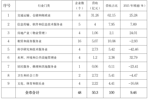 1-8月,九個行業門類營業收入增速呈現“四升五降”態勢。交通運輸、倉儲和郵政業、房地產業(物業管? 理)、水利環境和公共設施管理業3個行業發展速度最快,實現營業收入分別為25.28億元、1.06億元、1.2億元,同比增長分別為25.28%、24.01%、32.79%。1個行業平穩正增長,信息傳輸、軟件與信息技術服務業業營業收入分別為4億元,增速為7.89%。增速負增長的行業是科學研究與技術服務業、租賃和商務服務、居民服務、修理和其他服務業、衛生、社會工作和文化、體育和娛樂業和,實現營業收入2.73億元、5.07億元、0.06億元、2.72億元、2.22億元,同比下降16.68%、2.93%、23.41%、4.47%和13.1%。