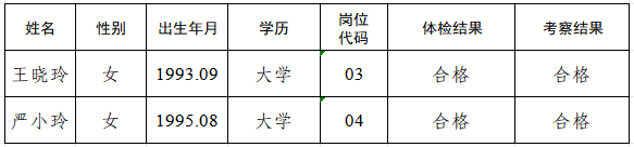 嘉峪關市2025年衛生健康系統基層醫療機構聘用制執業醫師面試、體檢及考察工作已全部結束。此前,王曉玲因懷孕、嚴小玲因哺乳未能完成體檢,現兩人已全部完成體檢。現公布體檢、考察結果,并將擬聘用人員名單公示如下,請社會各界監督。