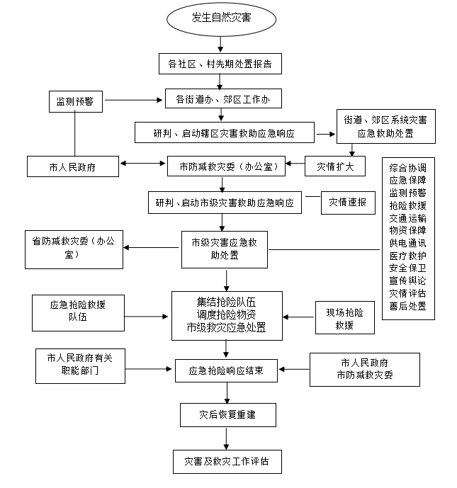 32.市消防救援支隊:自然災害發生后,負責對被壓埋幸存者和被困人員開展搜救;搶救埋壓的重要設備、物品、檔案,隔離易燃易爆危險品等;參與危房排險和執行特殊救援任務。