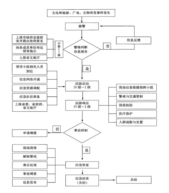 6.3 ?市文旅局在接到報告后,對重大(II級)和特重大(I級)突發公共事件,應在2小時內將有關情況上報市政府和省文旅廳,并在事件處理完畢后,及時做出完整書面報告。書面報告內容要包括:事故經過及處理、事故原因及責任、事故教訓、今后防范措施。